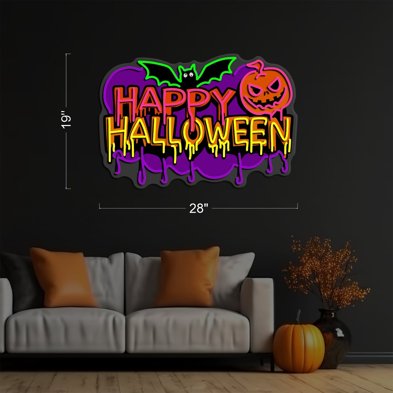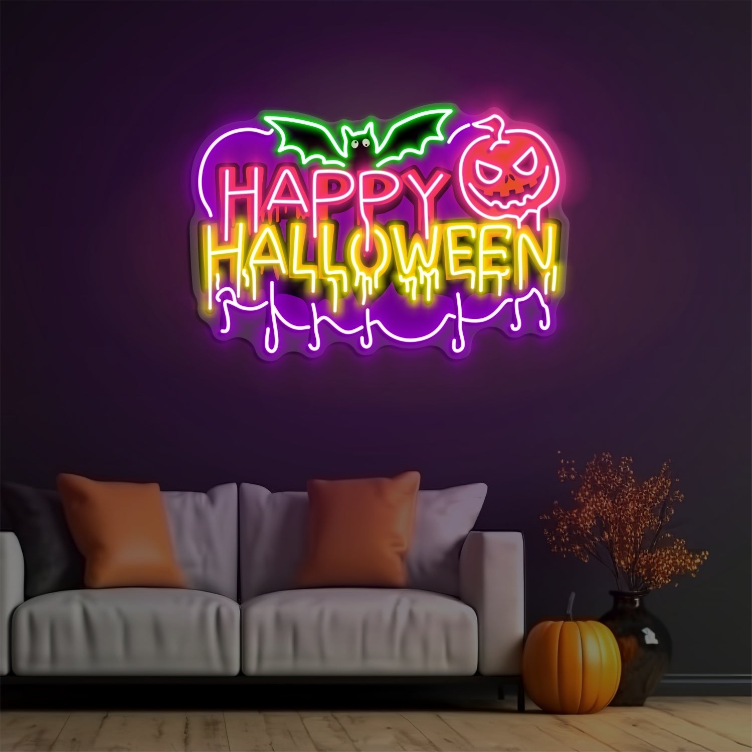 Light up your Halloween with the Happy Halloween Neon LED Sign with Bat & Pumpkin, a vibrant decoration that combines spooky charm with festive style. Featuring bold “Happy Halloween” lettering in glowing red and yellow, paired with a flying bat and a sinister jack-o’-lantern, this neon sign is perfect for creating a chilling party vibe.