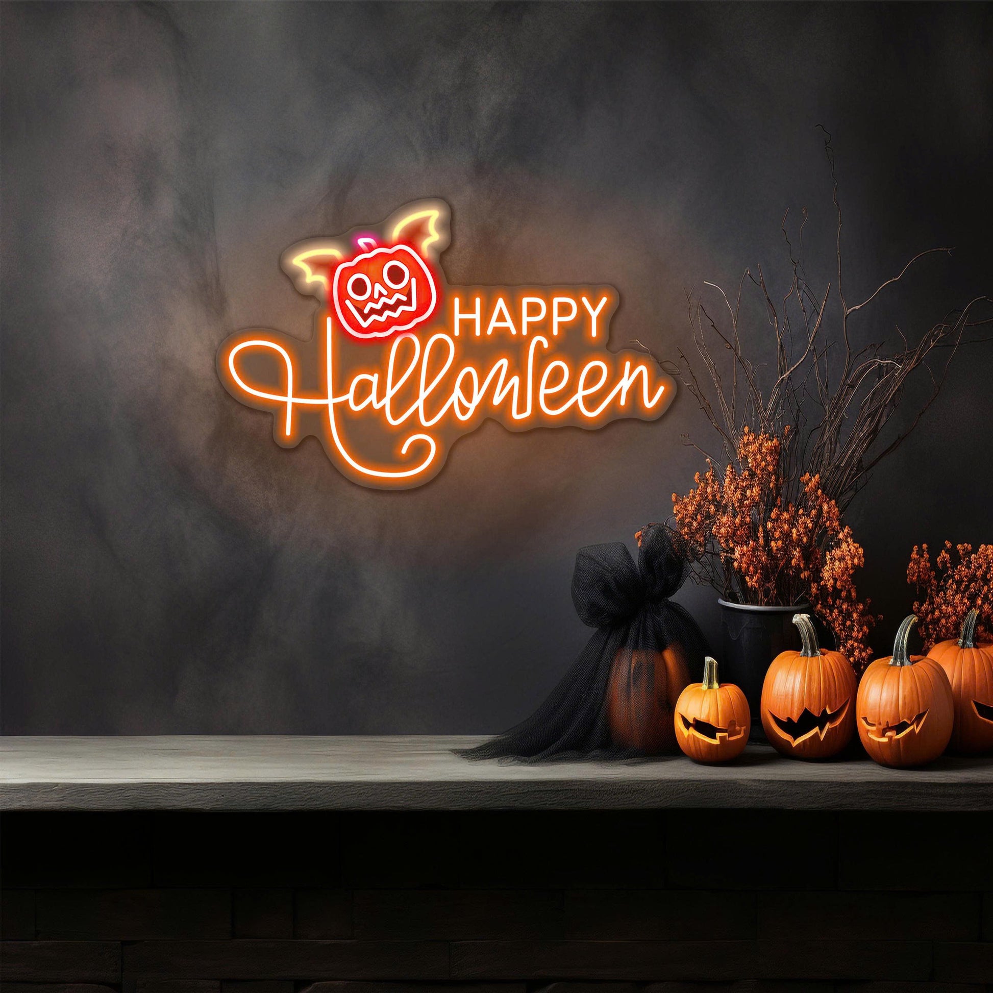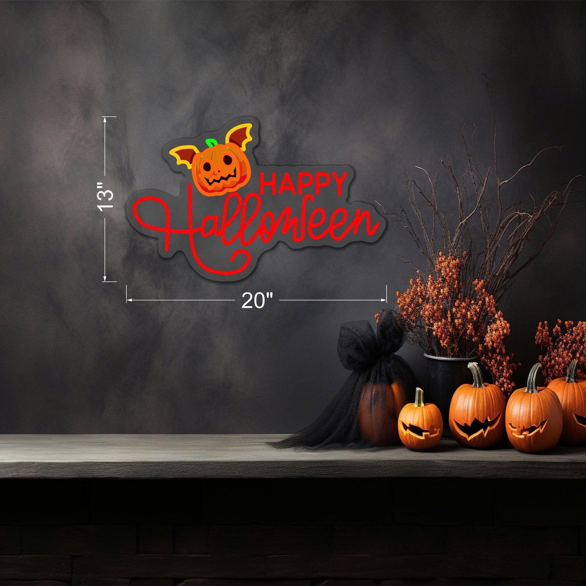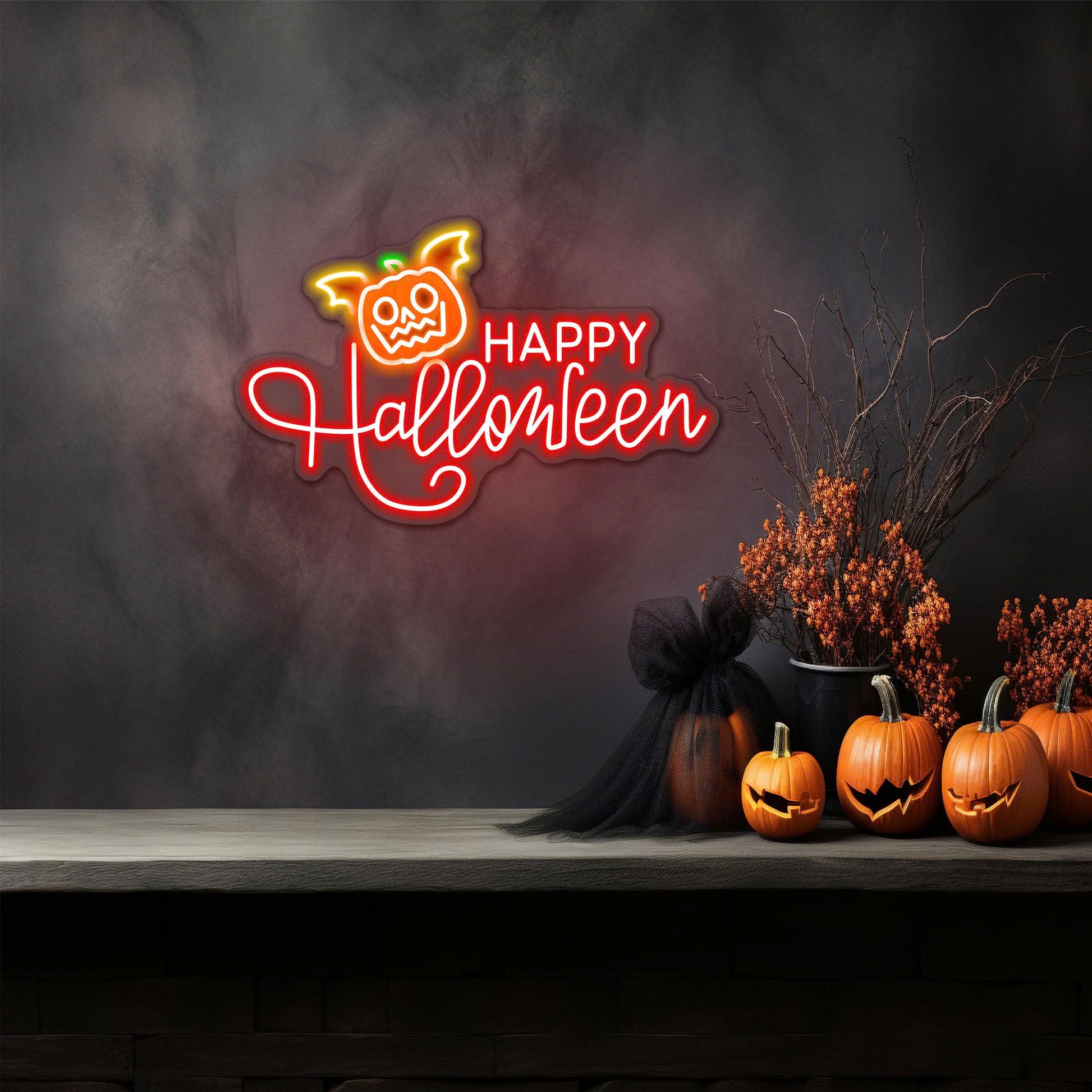 Celebrate the spooky season in glowing style with the Happy Halloween Neon LED Sign with Pumpkin. Featuring a cheerful jack-o’-lantern design with glowing yellow wings and bold red “Happy Halloween” lettering, this neon light is the perfect festive accent for any Halloween setup.