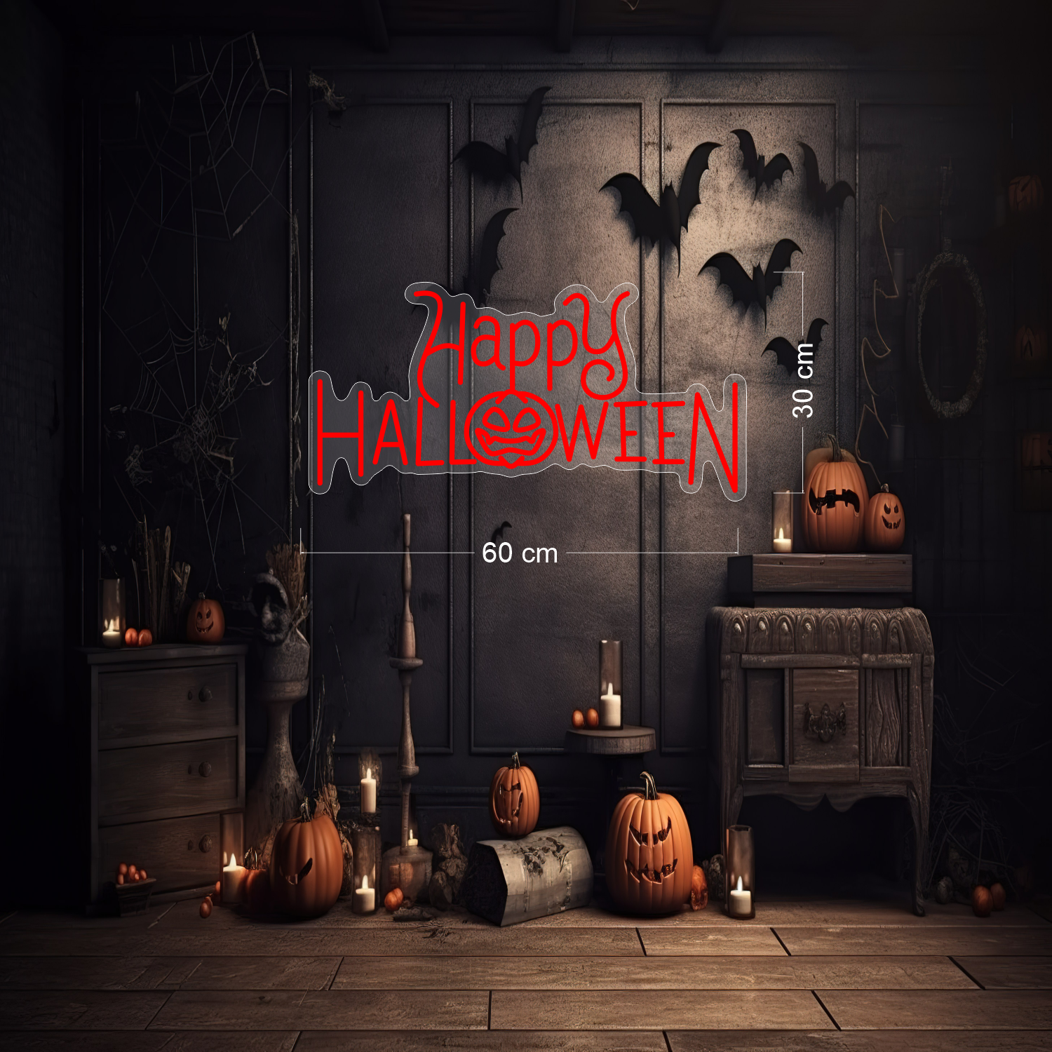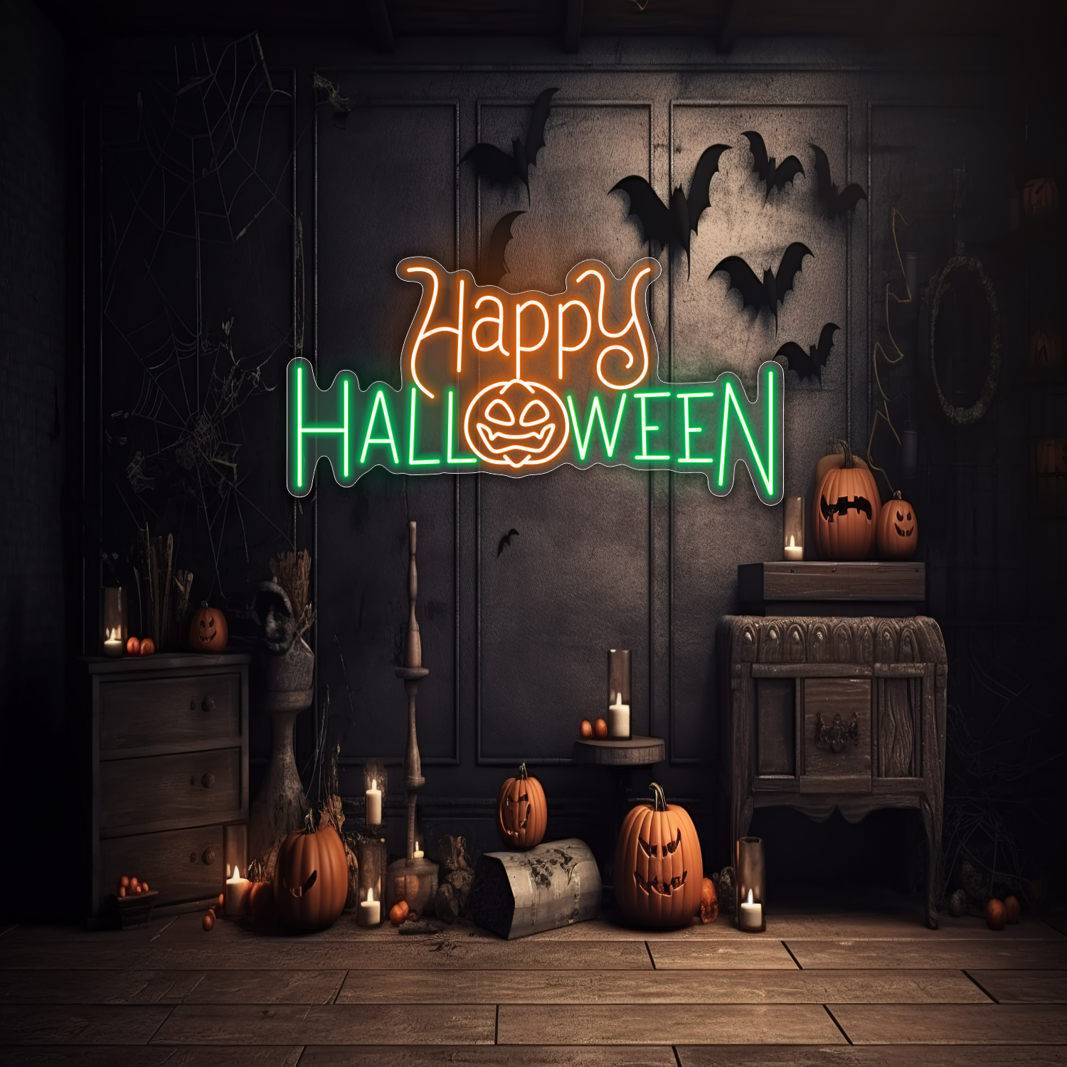 Celebrate the spooky season in glowing style with the Happy Halloween Neon LED Sign with Pumpkin. Featuring vibrant pink “Happy” text, glowing blue “Halloween,” and a cheerful jack-o’-lantern face at the center, this neon light is the perfect decoration to set a festive Halloween atmosphere.