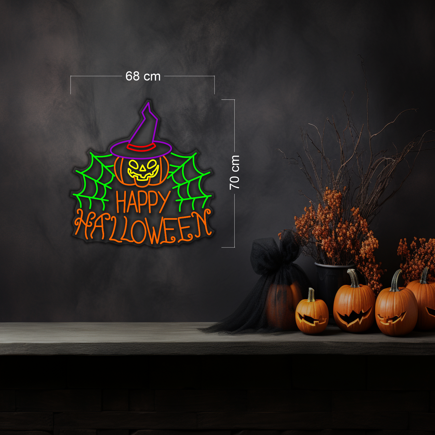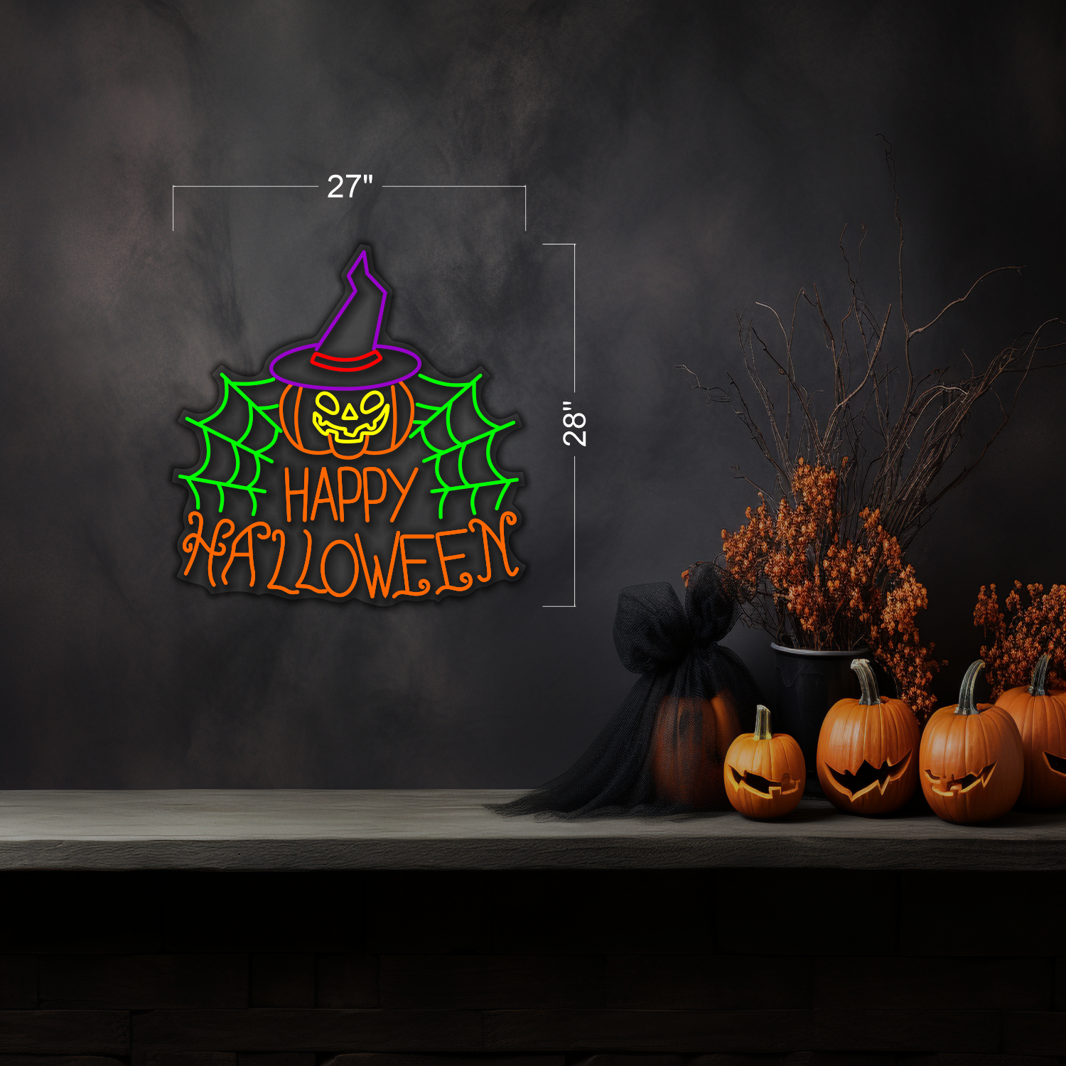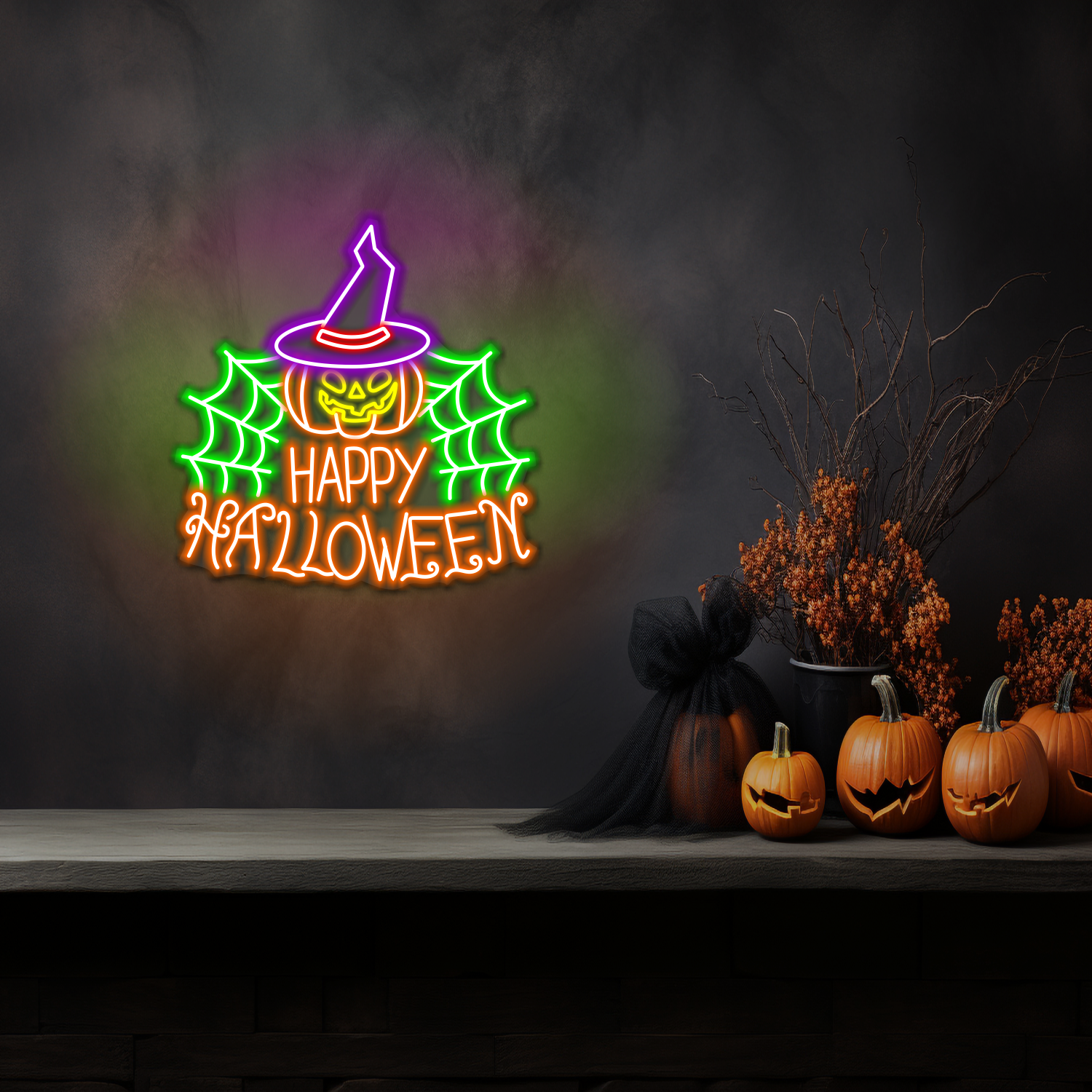 Bring your haunted nights to life with the Happy Halloween Neon LED Sign, featuring a glowing pumpkin in a witch hat surrounded by vibrant spider webs. With green, yellow, orange, and purple neon colors, this sign creates a spooky yet playful atmosphere that’s perfect for Halloween.