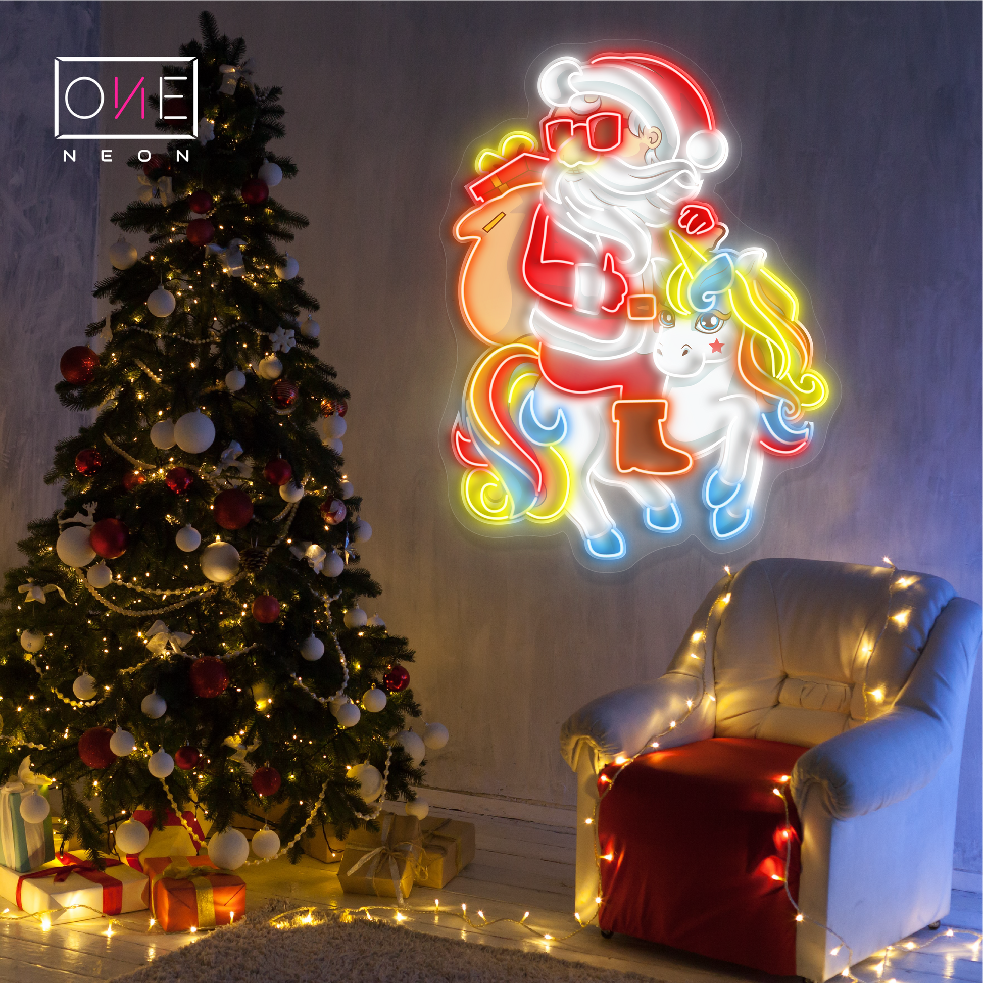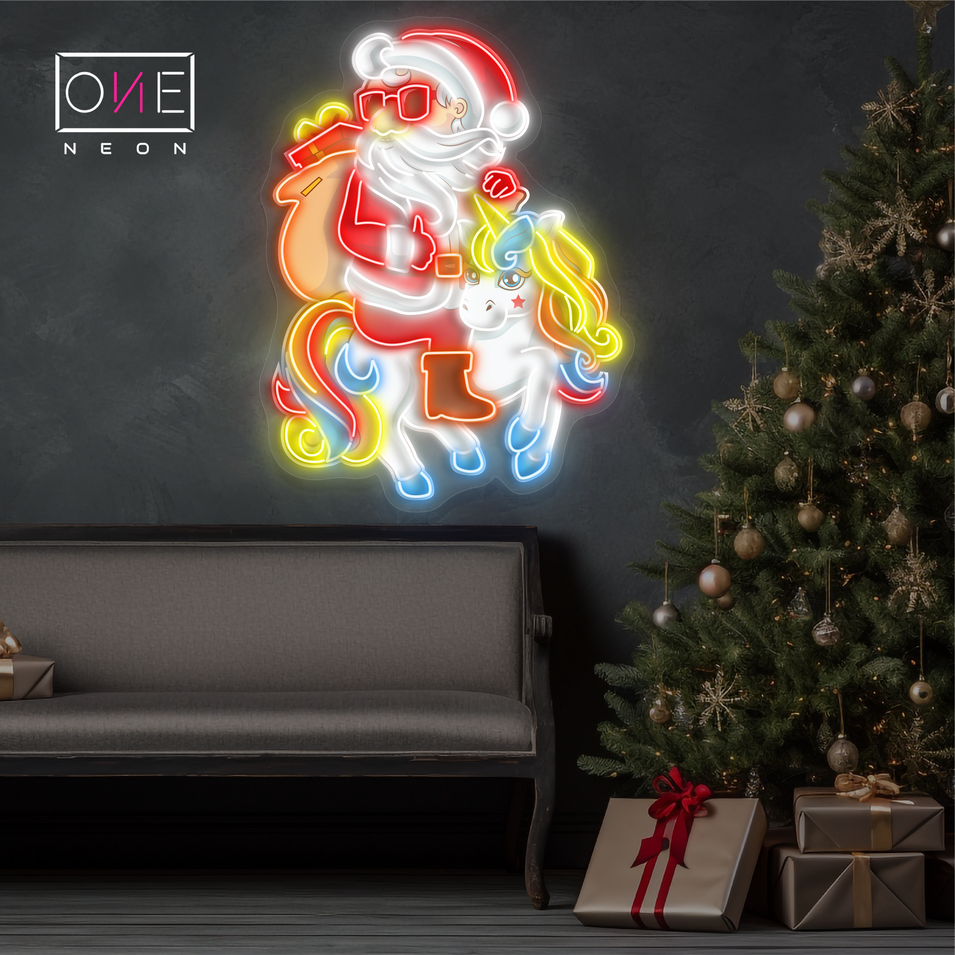🎅🦄✨ Santa and the Unicorn Christmas Artwork LED Neon Sign - Add a magical touch to your holiday decor with this unique LED neon sign featuring Santa and his unicorn friend! 🎄🌈 Perfect for Christmas festivities, it brings vibrant colors and a cozy glow to any space. Ideal for homes, cafes, or holiday events, this durable sign is energy-efficient and easy to install. 🎁💡